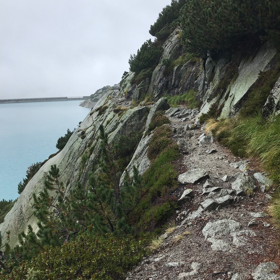 Endlich unten angekommen erfolgt der Weg am rechten Ufer des Gelmersees. Die Route führt nah an der glatten Felswand auf einem herausgesprengten Weg direkt über dem Gelmerseeentlang. Die spektakuläre kurze Passage ist mit Drahtseilen gesichert. Wenig später überquert man den Alplibach und geht in leichtem Auf und Ab am Ufer des Gelmersees entlang bis zur Staumauer. Die Sonne scheint mittlerweile und kein Wölkchen trübt den Himmel. Es ist traumhaft schön.